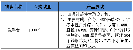 2017年采购1000个洗手台物资将运输到全国8个项目县,125所项目学校。洗手台具体参数如下: