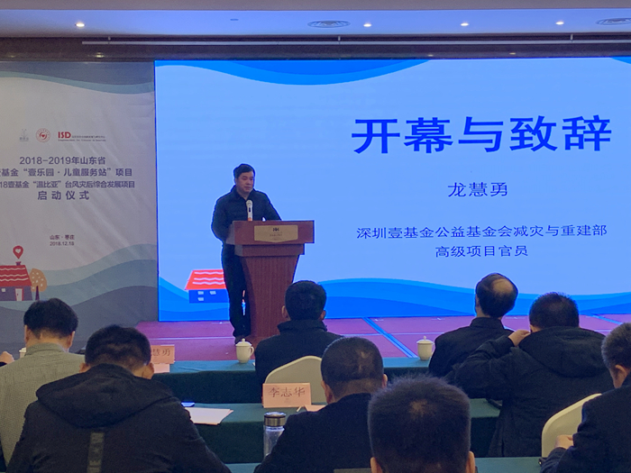 12月18日,壹基金“温比亚”台风灾后儿童服务和社区减灾及生计恢复综合发展项目(以下简称:壹基金“温比亚”台风灾后综合发展项目)暨2018年-2019年山东省壹基金“壹乐园儿童服务站”项目启动仪式在枣庄举办。山东省关心下一代工作委员会、共青团山东省委、山东省妇女联合会、枣庄市政府、枣庄市民政局、共青团枣庄市委、枣庄市妇女联合会等单位领导出席启动仪式。本次仪式由山东省慈善总会、山东省社会创新发展与研究中心、壹基金主办,枣庄市慈善总会、潍坊市慈善总会、济宁市慈善总会、菏泽市慈善总会、枣庄市台儿庄区民政局、枣庄市社会工作协会等单位支持。