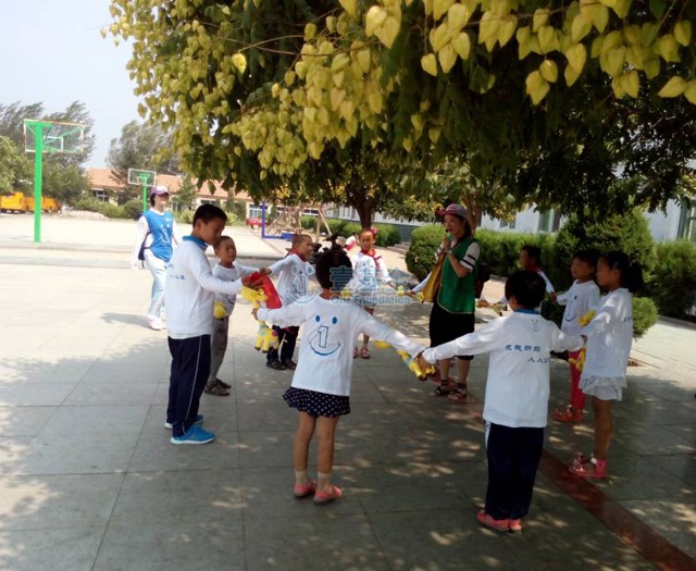 (壹基金洪灾温暖包发放结束后,志愿者带领孩子玩游戏)