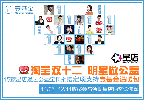 12月12日,林志玲、徐静蕾、安钧璨、加措活佛等16位明星携手支持壹基金温暖季公益活动,于淘宝星店中发起“双12明星都来做公益”的爱心行动。其中,15位明星及星店郑重承诺——在“双十二”这天,每售出一件公益宝贝,都会向壹基金2013年温暖季活动捐赠相应的爱心善款,为灾后儿童及贫困地区孤儿送去壹基金温暖包,温暖他们的冬天。这是淘宝购物狂欢季“双十二”开幕后,揭幕的一次大型明星公益行动。