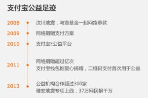 2008年,支付宝与壹基金联合推动公益捐赠,此后陆续针对公益机构推出“网络捐赠支付方案”(2009年),支付宝E公益平台上线(2010年),2011年,支付宝网络捐赠超过一亿次,二维码也首次应用于公益事业。