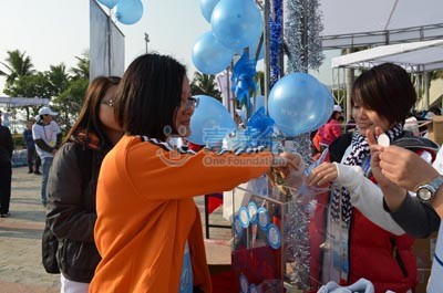 参赛者在现场公益展区互动 参赛者支持壹基金“为爱奔跑”