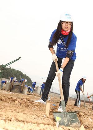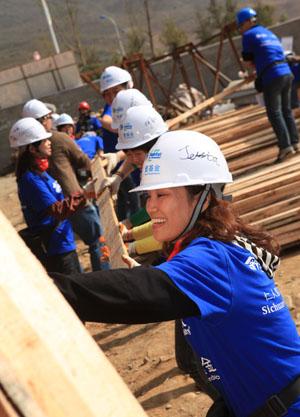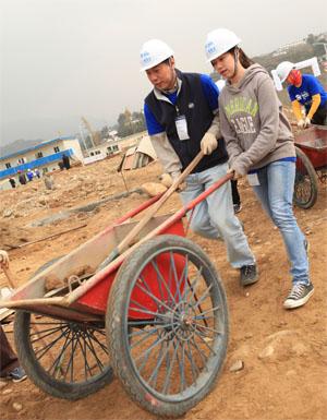 四天的建屋时间虽然短暂,但却给所有志愿者们留下了一段难忘的人生经历和特殊体验。来自成都的小包是一位白领,这是他第一次参加公益活动,在忙完上午半天的铲石块之后累得气喘吁吁,大呼:“原来盖房子是这么难的一件事情!”以前都很少这样动手干活的他两天以来干的活比一年都多,但是却感到很快乐很有意义,因为不是为了自己,而是在帮助别人。而来自上海的麻静别看个子瘦小,做事却很泼辣,第一天扎钢筋的时候直接就翻身爬上钢筋圈坐下,开始干活。劳动间隙她还带领小组的成员们唱起劳动歌曲,给所有志愿者们鼓劲。她说来到这里就是来参加劳动的,很多事情都是第一次做,所以更要认真做,参加这次活动给她印象最深的就是每一个人包括她自己都总想再多做一点,只可惜活动的时间太短了。来自美国的Phil这次是带着16岁的儿子Ryan还有15岁的女儿Emma一起来参加的,以前在美国他们经常参加义工活动,但是盖房子却还是第一次,Phil表示这次活动对于他和孩子们都是一次绝佳的人生经历,希望孩子们能由此了解关爱、合作与希望的意义。在所有的志愿者中,还有一位是2000年27届悉尼奥运会20公里女子竞走金牌获得者王丽萍。作为壹基金的一位特别义工代表,王丽萍专程从广州亚运会现场赶到竹园参加本次活动,当被问到盖房子和比赛相比较,哪个更难,这位世界冠军笑着说:“都不容易,志愿者和运动员都需要信念和坚持,也都需要团队的配合,非常感谢壹基金和仁人家园发起这次活动,既可以帮助别人,又能够锻炼自己。”本次“仁人壹家 公益创家园”——竹园镇灾后重建项目是壹基金和仁人家园合作开展的第一个灾后重建项目,整个工程计划在明年5月完工,在明年6月前,受帮扶的家庭就可入住新家。