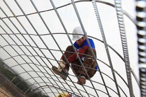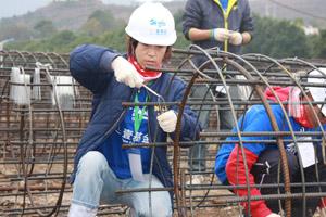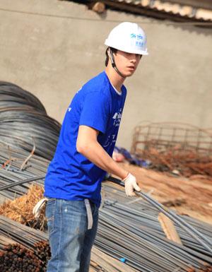 来自成都的志愿者小包 王丽萍和志愿者们一起参与扎钢筋