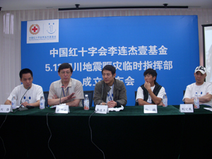 5月21日,中国红十字会李连杰壹基金“5.12四川地震赈灾指挥部(临时)”在成都正式成立。这是壹基金首次成立实体进行自然灾难救助,标志着壹基金此次四川地震的赈灾工作已经从最初的紧急救助阶段转入到长期持续的灾后重建阶段。中国红十字会总会四川抗震救灾工作队队长洪俊岭、中国红十字会博爱大使、壹基金发起人李连杰、壹基金永久义工代表孙楠、刘宏胤出席了成立发布会,向媒体介绍赈灾指挥部的情况。