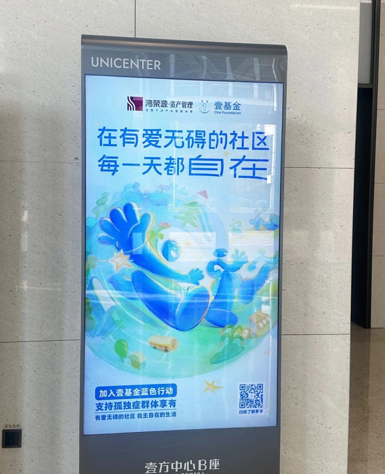 鸿荣源资产管理公司联合旗下写字楼、产业园、长租公寓、社区商业租户共同开展孤独症主题公益广告宣传,号召社会公众共同为孤独症群体助力。