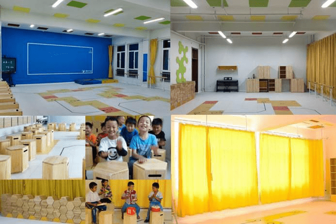 [改造后的音乐教室不仅有彩色吸音吊顶、落地黑板,还有可击打的音乐凳(叠加后可作书桌)、可作为舞台背景的有轨窗帘等等]