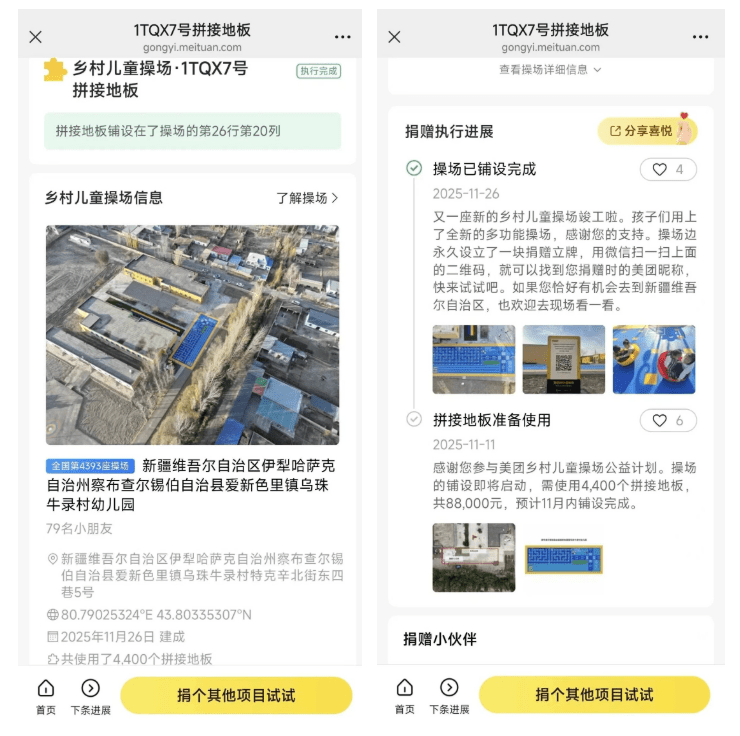 2020年落地贵州的第一座乡村儿童操场,就来自于近千家美团平台公益商家捐赠。爱心在美团公益平台汇聚,“人人公益”是壹基金成立十八年以来一直未变的愿景和基因。为凝聚分散的社会爱心和捐赠,项目依托美团技术,自主研发善款追踪系统(DTS),实现每笔捐赠(20元对应一块地板)流向实时可查每一块地板所在操场的第几行第几列、精准到铺设位置,并通过操场二维码立牌让捐赠人“被看见”,实现“捐赠-执行-反馈”的全流程透明化。
