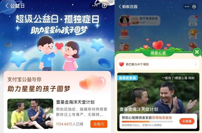 壹基金参与支付宝公益联合蚂蚁庄园共同发起的“超级公益日 |世界孤独症日”主题活动,通过蚂蚁庄园公益视频及生活号文章等形式开展公益传播。同时,壹基金海洋天堂计划项目正式上线蚂蚁庄园,用户可通过捐赠爱心蛋一起助力孤独症群体及其家庭,让爱不孤单。