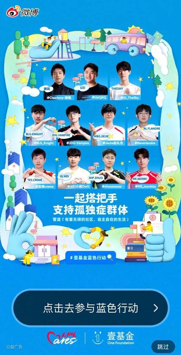 LPL Cares、珠海万达商管北区公司、佳兆业文商旅集团、大悦城控股商业、永旺梦乐城、新世界百货、巴黎春天、知乎、网易云音乐、荣万家、58同城、赶集招聘、安居客、广州携旅集团、荟聚、搜狐新闻追光计划、诗莉莉酒店集团等爱心传播伙伴共同支持蓝色行动公益倡导。