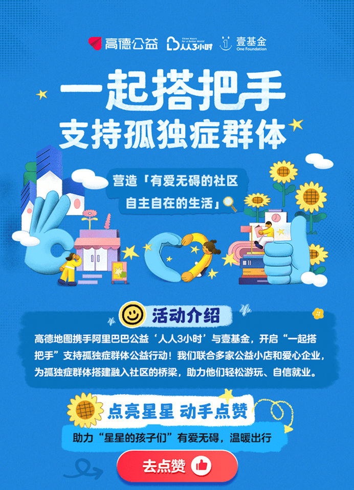 在蓝色行动期间,阿里巴巴公益壹基金天猫官方公益店铺联动支付宝“碰一下”,让公益传播从“被动观看”走向“主动体验”。“人人3小时”公益平台与高德公益联合发起“大城小店”公益活动,支持壹基金蓝色行动,邀请达人线下探店,并设计公众可参与的互动环节,助力公益小店实现可持续运营。活动还携手爱心企业正佳集团,开展线上互动:高德地图用户可通过“点赞”的方式,与正佳集团一起“为星星的孩子搭把手”,4月公益月期间,孤独症人士本人及一名家属可免费游玩正佳海洋馆、雨林馆、博物馆、科学馆四大爱心项目一次。