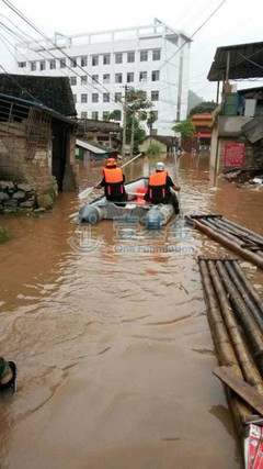 7月22日,壹基金工作人员与救援队队员前往锦山镇桥坡村实地灾情评估,为发放第二批救灾物资做准备。